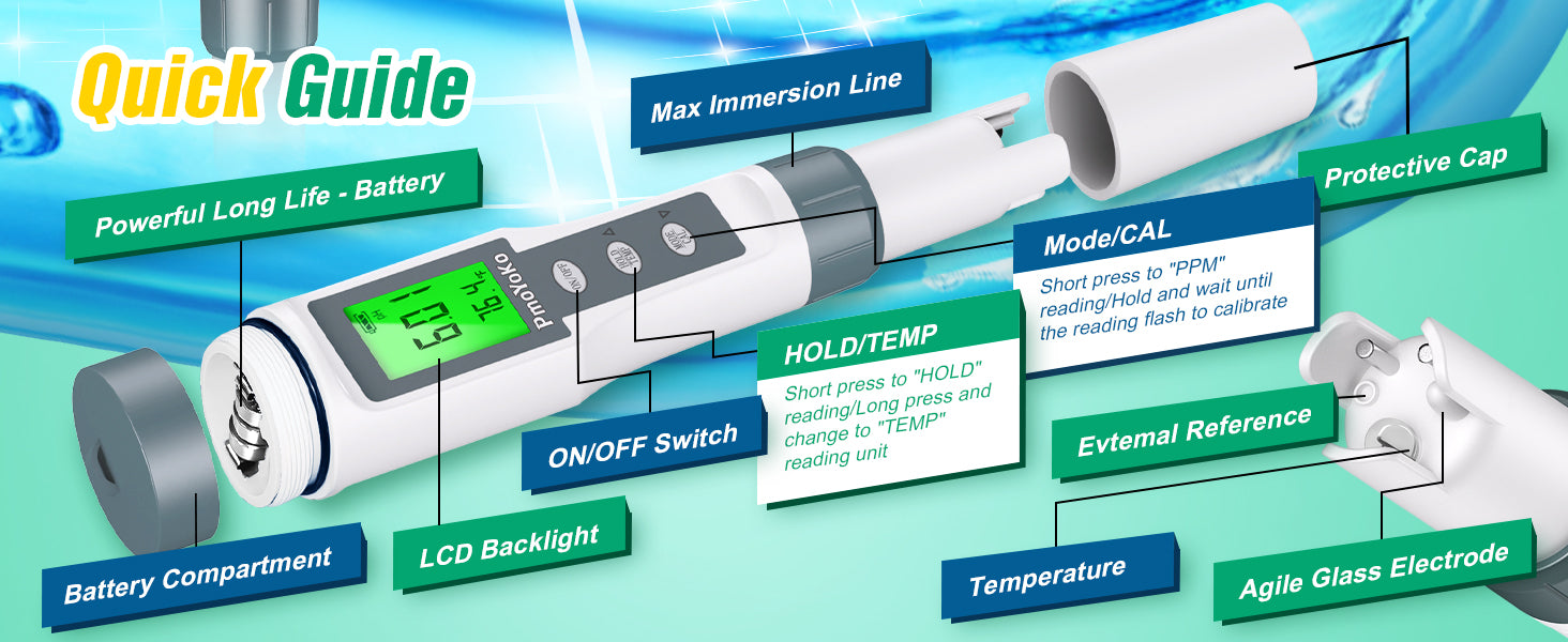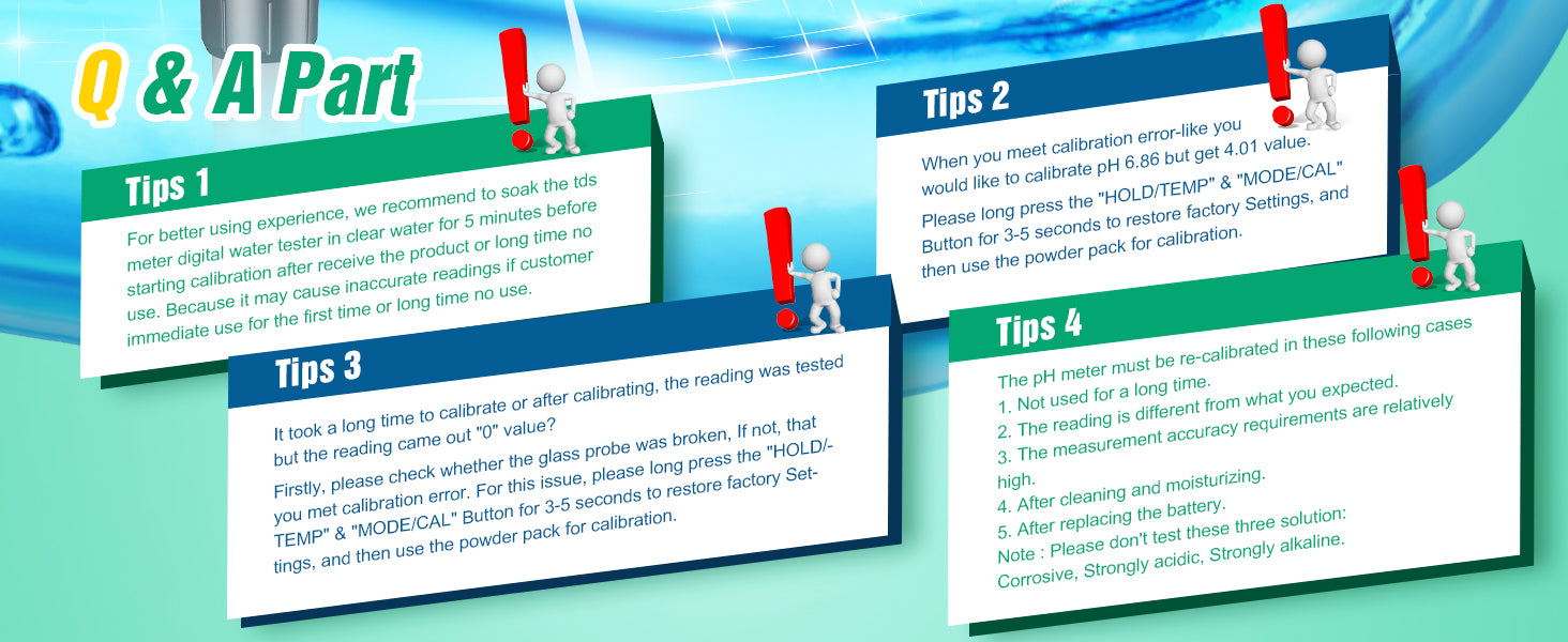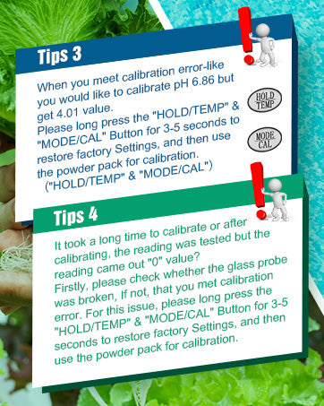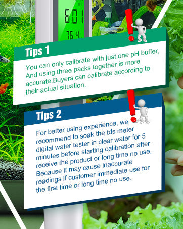【How to calibrate the pH Meter/TDS Meter?】 1. Add pH4.00/pH6.86/pH9.18 buffer powder into water and stir it. 2. Press the ON/OFF button and adjust to pH mode. Put the electrode into pH4.00/pH6.86/pH9.18 standard solution and wait 5~10 seconds. 3. Press and hold the MODE/CAL button and release after 6 seconds; wait pH4.00/pH6.86/pH9.18 flash 3 times till readings are no longer flashing, finish the pH calibration.