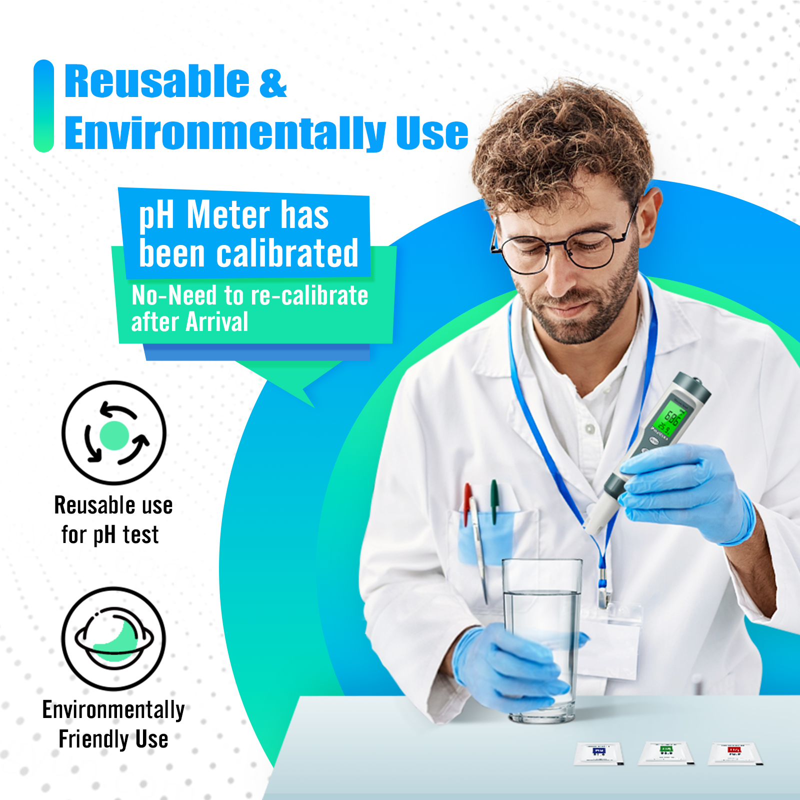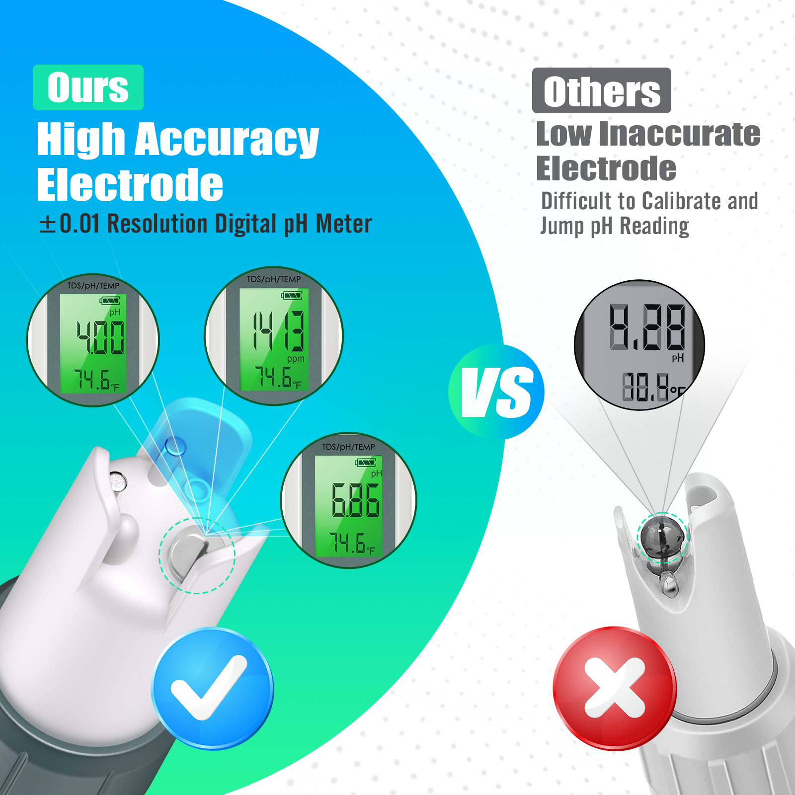 【High Accuracy pH Meter for Water】High-accuracy algorithm chip and electrode of our digital water ph meter ensure accurate and fast response. Green Backlit LCD Design guarantees that you can read the measuring results in any condition. One-button lock reading function helps lock reading even if the tds Meter is taken out of the sample!
